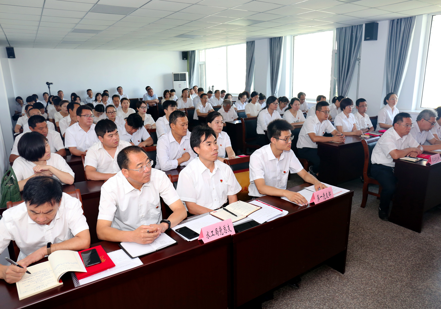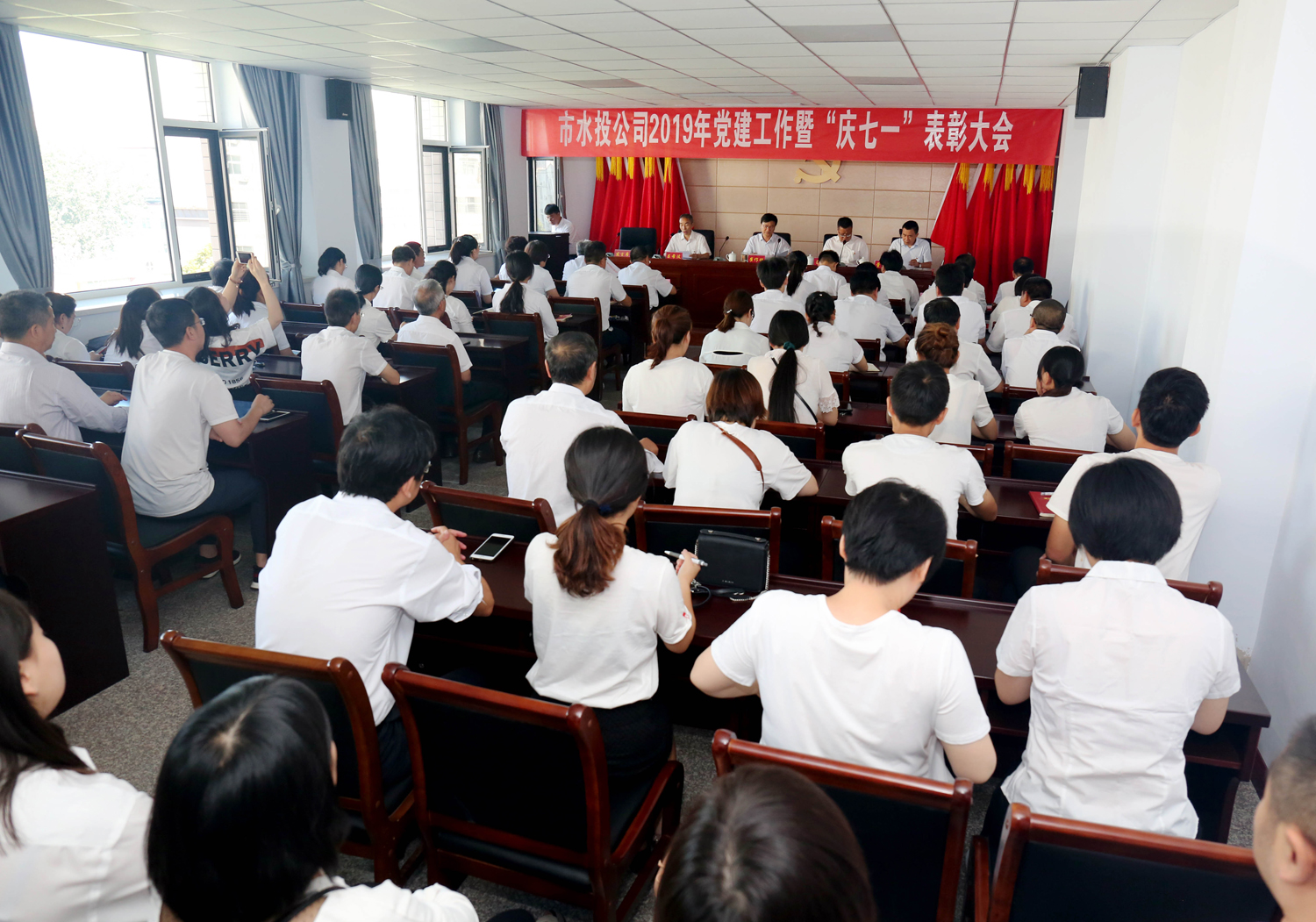 7月1日,市水投公司召開2019年黨建工作暨“慶七一”表彰大會。會議由公司黨委委員呂希汶主持,公司黨委班子成員、各支部書記及全體黨員80余人參加。市國資委黨建和領(lǐng)導干部管理科科長呂增軒、副科長董政軍蒞臨大會指導。