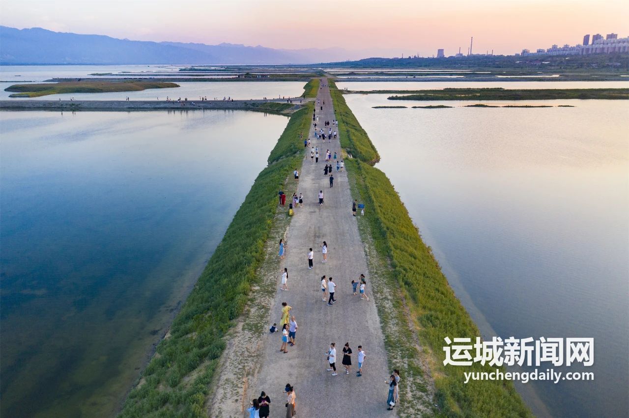 清晨6點,中條山下涼風習習,靜謐清麗。但圍繞鹽湖岸畔的步道上,穿著清涼晨跑的,扯著嗓子練聲的,舉著相機拍照的,人來人往,生命涌動的力量激蕩著黎明的寧靜。待清晨的第一縷陽光瀉向湖面,自帶柔光濾鏡,碧波浩渺,遠山蒼茫,美得不可方物。